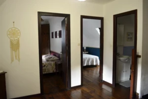 À l’étage, avec le charme d’un parquet bois et poutres apparentes, vous disposez de 3 chambres doubles dont une avec salle de douche privative, ainsi que d’1 chambre avec 4 lits simples. Sur la pièce palière, un WC indépendant avec meuble vasque.